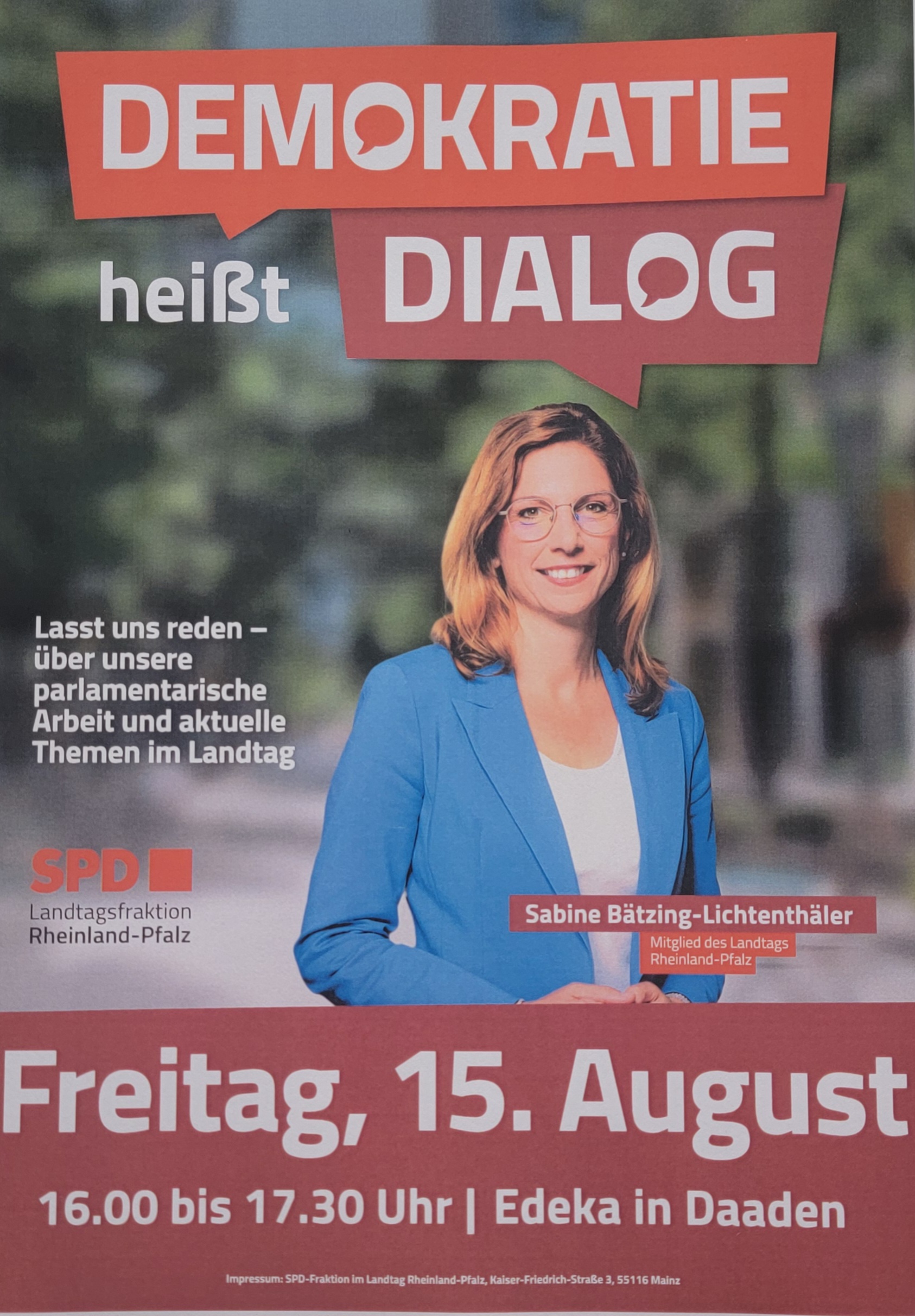 „Demokratie heißt Dialog“: Unter diesem Motto sind die Abgeordneten der SPD-Landtagsfraktion schon seit einigen Monaten in ganz Rheinland-Pfalz unterwegs, um auf Marktplätzen, in Innenstädten und im Dorfkern mit den Menschen im Land in den Meinungsaustausch zu kommen. Mit dem Demokratie-Bus, einem kleinen Info-Stand und Informationen zur parlamentarischen Arbeit der SPD-Landtagsfraktion sowie den parlamentarischen Themen im Landtag macht auch die heimische Abgeordnete Sabine Bätzing-Lichtenthäler am Freitag, dem 15. August von 16 – 17:30 Uhr am Edeka in Daaden Station. Alle Bürgerinnen und Bürger sind herzlich eingeladen zum Austausch über die parlamentarische Arbeit der SPD-Landtagsfraktion und deren konkreten Auswirkungen vor Ort. „Ich freue mich sehr auf den Dialog vor Ort und möchte einfach so oft wie möglich Gelegenheit geben mitzureden, Wünsche und Anliegen zu formulieren und zuzuhören“, sagt die SPD-Abgeordnete, die sich auf den Termin und einen intensiven Austausch mit den Bürgerinnen und Bürgern freut. „Demokratie lebt vom Mitreden, vom Miteinander, vom Mitmachen – Demokratie bedeutet, immer im Dialog zu bleiben.“