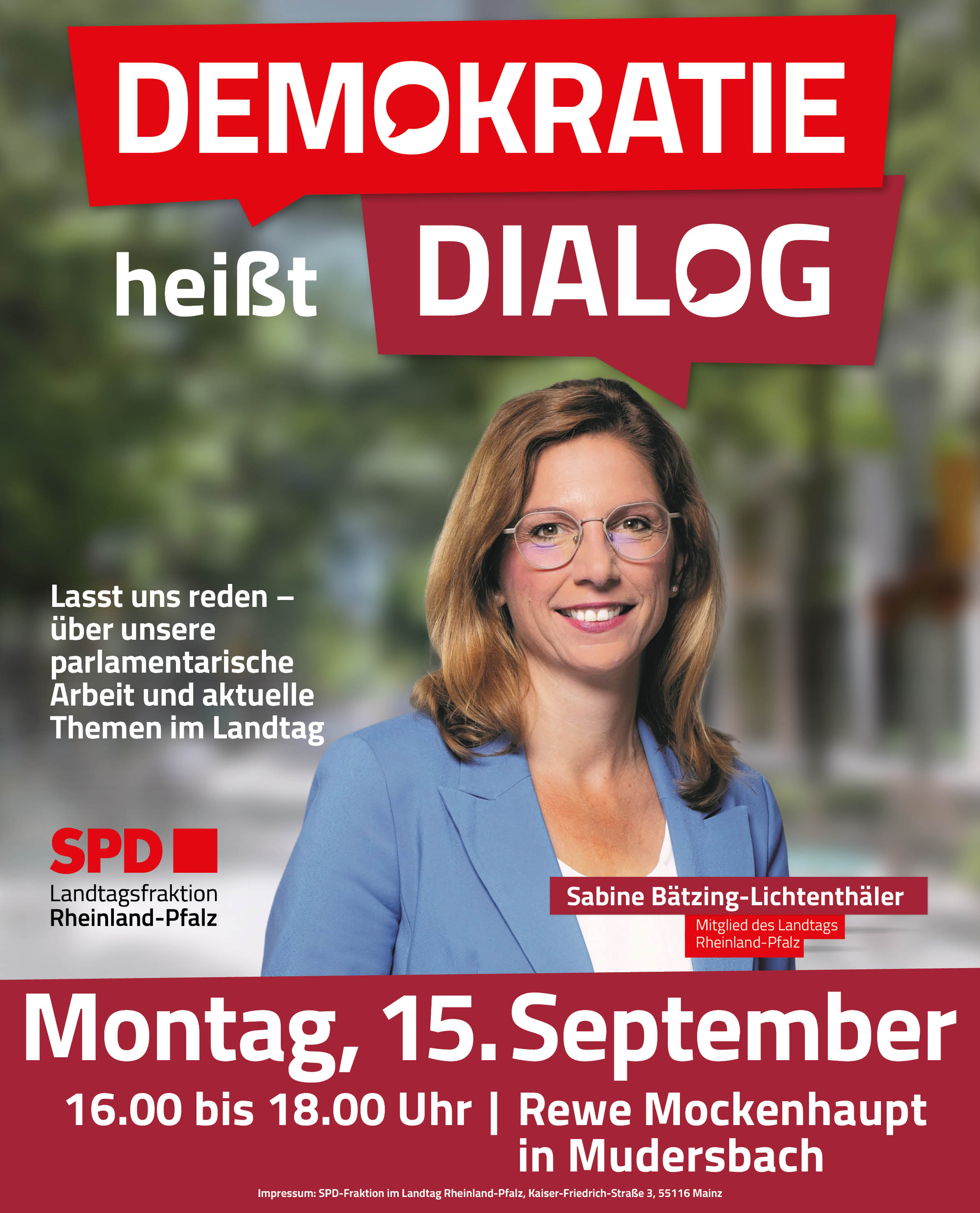 „Demokratie heißt Dialog“: Unter diesem Motto sind die Abgeordneten der SPD-Landtagsfraktion schon seit einigen Monaten in ganz Rheinland-Pfalz unterwegs, um auf Marktplätzen, in Innenstädten und im Dorfkern mit den Menschen im Land in den Meinungsaustausch zu kommen. Mit dem Demokratie-Bus, einem kleinen Info-Stand und Informationen zur parlamentarischen Arbeit der SPD-Landtagsfraktion sowie den parlamentarischen Themen im Landtag macht auch die heimische Abgeordnete Sabine Bätzing-Lichtenthäler am Montag, den 15. September von 16:00 – 18:00 Uhr am REWE Mockenhaupt in Mudersbach Station. Alle Bürgerinnen und Bürger sind herzlich eingeladen zum Austausch über die parlamentarische Arbeit der SPD-Landtagsfraktion und deren konkreten Auswirkungen vor Ort. „Ich freue mich sehr auf den Dialog vor Ort und möchte einfach so oft wie möglich Gelegenheit geben mitzureden, Wünsche und Anliegen zu formulieren und zuzuhören“, sagt die SPD-Abgeordnete, die sich auf den Termin und einen intensiven Austausch mit den Bürgerinnen und Bürgern freut. „Demokratie lebt vom Mitreden, vom Miteinander, vom Mitmachen – Demokratie bedeutet, immer im Dialog zu bleiben.“