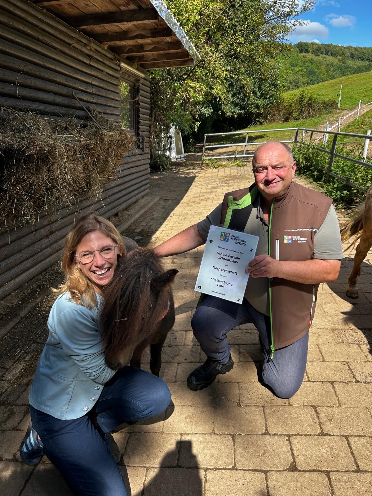 Niederfischbach – Große Freude im Tierpark Niederfischbach: Sabine Bätzing-Lichtenthäler, SPD-Vorsitzende Rheinland-Pfalz und Landtagsabgeordnete, hat die Patenschaft für Pino, den jüngsten Neuzugang bei den Shetlandponys, übernommen. Tierparkleiter Gerd Braas überreichte die Patenschaftsurkunde im Rahmen eines Besuchs.