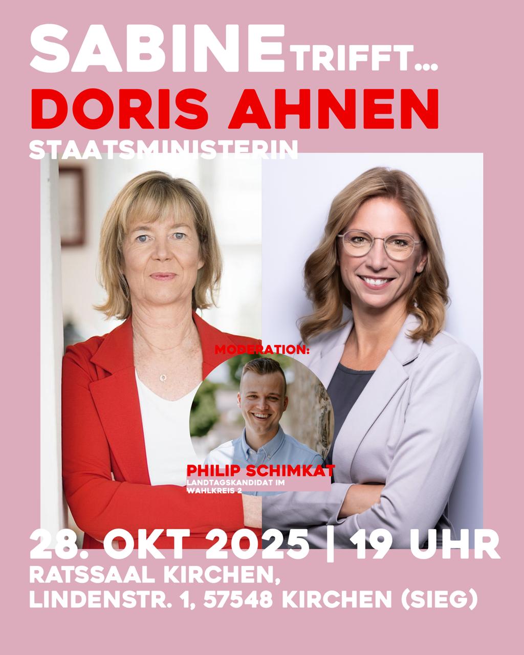 „Ich freue mich sehr, mit Doris Ahnen eine erfahrene und anerkannte Ministerin in Kirchen begrüßen zu dürfen. Sie hat über viele Jahre hinweg gezeigt, wie verantwortungsvoll und zukunftsorientiert Landespolitik gestaltet werden kann – gerade im Bereich des Bauens und Wohnens“, betont Sabine Bätzing-Lichtenthäler. „Gemeinsam mit dem Landtagskandidaten Philip Schimkat, der die Diskussion moderieren wird und der sich aus beruflichen Gründen bestens in den Themen auskennt, können wir den Blick sowohl auf die großen landespolitischen Linien als auch auf die konkreten Herausforderungen vor Ort richten. So gelingt es, Expertise aus Mainz mit den Erfahrungen und Anliegen unserer Region zu verbinden.“