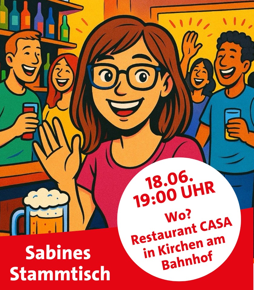 Im Rahmen ihrer Veranstaltungsreihe „Sabines Stammtisch“ lädt die heimische Landtagsabgeordnete Sabine Bätzing-Lichtenthäler interessierte Bürgerinnen und Bürger am Mittwoch, den 18. Juni, 19-20 Uhr, ins Restaurant Casa nach Kirchen ein. An dem Abend steht das Gespräch und der Austausch im Vordergrund.