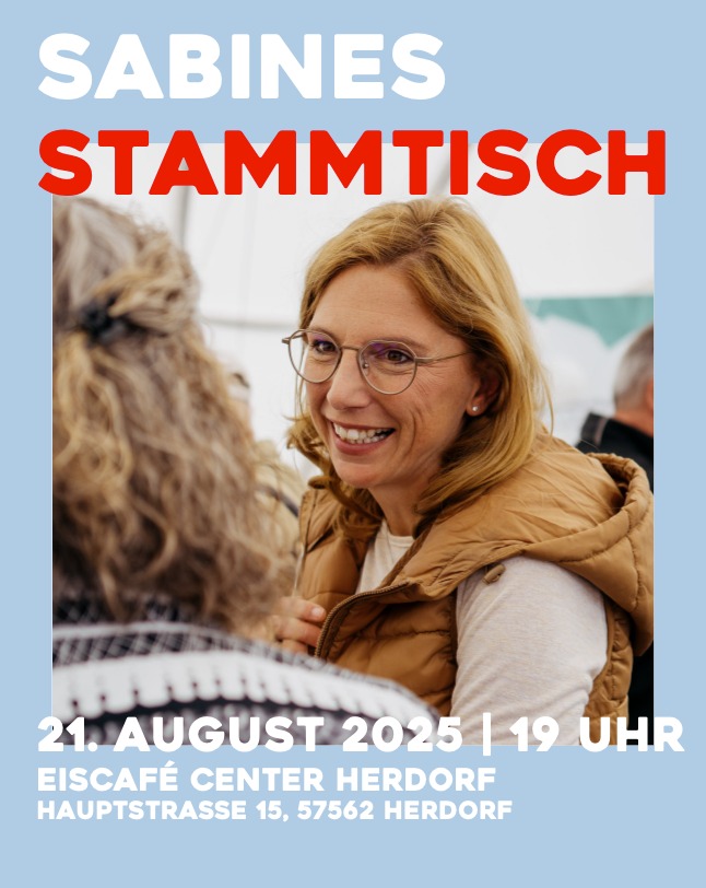 Im Rahmen ihrer Veranstaltungsreihe „Sabines Stammtisch“ lädt die heimische Landtagsabgeordnete Sabine Bätzing-Lichtenthäler interessierte Bürgerinnen und Bürger am Donnerstag, den 21. August, 19-20 Uhr, in das Eiscafé Center in Herdorf ein. An dem Abend steht das Gespräch und der Austausch im Vordergrund. Es gibt weder eine Tagesordnung noch einen Themenschwerpunkt und auch Zuhörerinnen und Zuhörer sind am Stammtisch herzlich willkommen. Neben diesem Gesprächsformat, das die SPD-Politikerin bereits seit Jahren durchführt, bietet sie auch mit dem „AnsprechBar-Infostand“, der Wanderaktion „Sabine bewegt“, dem Gesprächsangebot für junge und junggebliebene Menschen „Burger mit Bätzing“ sowie der telefonischen und der Präsenzsprechstunde zahlreiche Möglichkeiten der niedrigschwelligen Kommunikation an. „Von großer Wichtigkeit ist für mich der direkte Kontakt zu den Menschen in meiner Region. An diesem Abend können wir ganz ungezwungen miteinander ins Gespräch kommen und uns über dieses oder jenes Thema austauschen. So weiß ich, wo der Schuh drückt und kann im besten Fall Abhilfe schaffen“, erläutert die Vorsitzende der SPD-Fraktion im Landtag von Rheinland-Pfalz. Anmeldungen sind nicht erforderlich.