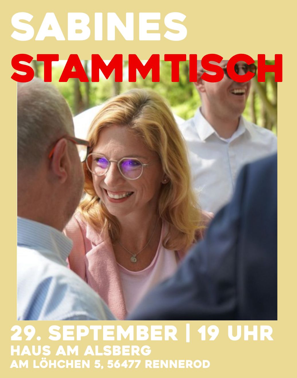 Im Rahmen ihrer Veranstaltungsreihe „Sabines Stammtisch“ lädt die heimische Landtagsabgeordnete Sabine Bätzing-Lichtenthäler interessierte Bürgerinnen und Bürger am Montag, den 29. September, von 19-20 Uhr in das Haus am Alsberg, Am Löhchen 5, 56477 Rennerod, ein. An dem Abend stehen das Gespräch und der Austausch im Vordergrund. Es gibt weder eine Tagesordnung noch einen Themenschwerpunkt und auch Zuhörerinnen und Zuhörer sind am Stammtisch herzlich willkommen. Neben diesem Gesprächsformat, das die SPD-Politikerin bereits seit Jahren durchführt, bietet sie auch mit dem „AnsprechBar-Infostand“, der Wanderaktion „Sabine bewegt“, dem Gesprächsangebot für junge und junggebliebene Menschen „Burger mit Bätzing“ sowie der telefonischen und der Präsenzsprechstunde zahlreiche Möglichkeiten der niedrigschwelligen Kommunikation an. „Von großer Wichtigkeit ist für mich der direkte Kontakt zu den Menschen in meiner Region. An diesem Abend können wir ganz ungezwungen miteinander ins Gespräch kommen und uns über dieses oder jenes Thema austauschen. So weiß ich, wo der Schuh drückt, und kann im besten Fall Abhilfe schaffen“, erläutert die Vorsitzende der SPD-Fraktion im Landtag von Rheinland-Pfalz. Anmeldungen sind nicht erforderlich.