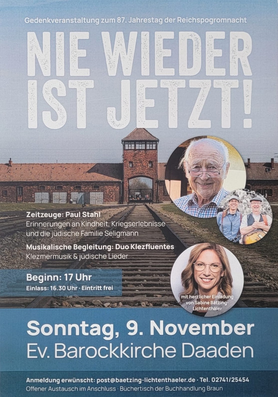 Am Sonntag, 9. November 2025, lädt die heimische Landtagsabgeordnete Sabine Bätzing-Lichtenthäler gemeinsam mit der evangelischen Kirchengemeinde Daaden zur traditionellen Gedenkveranstaltung in die Barockkirche zu Daaden ein. Beginn ist um 17:00 Uhr; Einlass ab 16:30 Uhr. Der Eintritt ist frei.